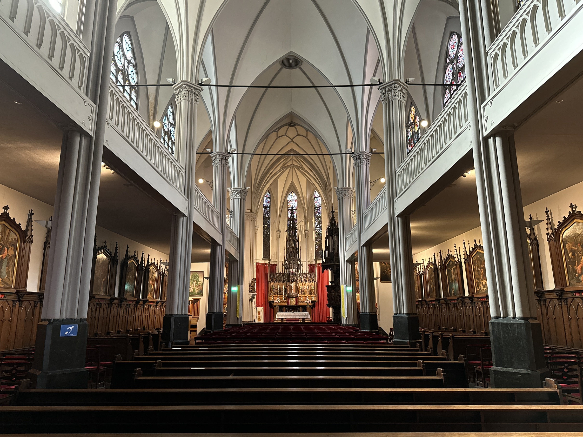 With this message still in mind, we step into the church: through a revolving door and a vestibule we enter the interior. Many visitors are surprised by the vast space. You would never expect it behind that narrow façade! The use of oak for the furnishings and the deep red of the upholstery give the church a warm atmosphere. Open to everyone during the day, the church seems to call you to step away for a moment from the bustle of the busy shopping street.