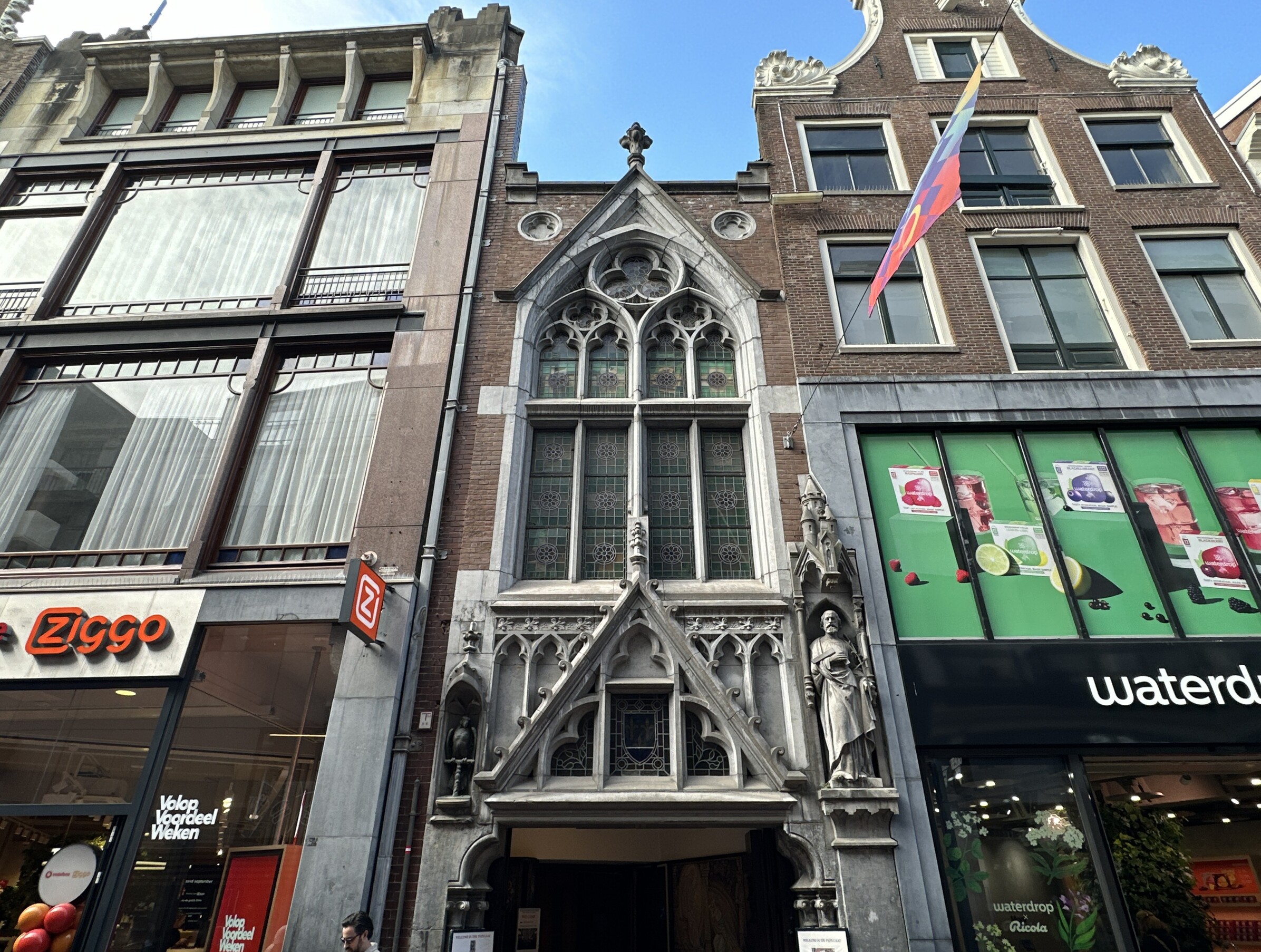 The doors of this narrow church building on the busy Kalverstraat are usually open during the day. It invites you to step inside. But first, let’s take a look at the façade. It is the Neo-Gothic entrance to a church that has stood here since the seventeenth century. At that time, there was a hidden church in the garden of a house called De Papegaai (“The Parrot”). That explains the curious name of the church. The façade was not recognizable as a church then, because Catholic churches were not allowed to be visible from the public street in Protestant Amsterdam.