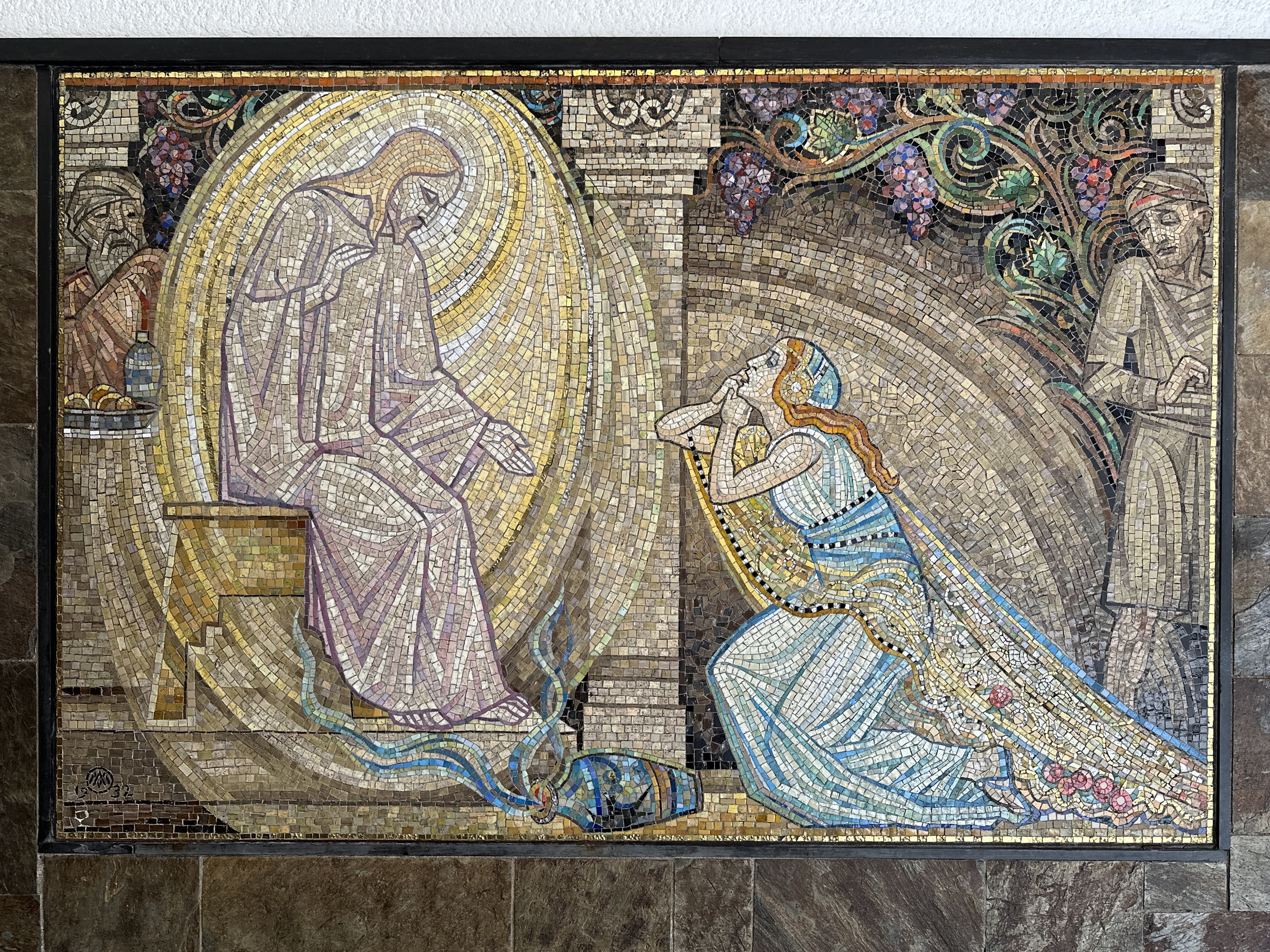 Let us now enter the porch, decorated with colorful mosaics. The largest one, on the right, depicts the penitent Mary Magdalene at the feet of Christ. In the Catholic tradition, she symbolizes the sinful person who repents, but the artist Antoon Molkenboer also meant her to represent the worldly woman shopping in the Kalverstraat.