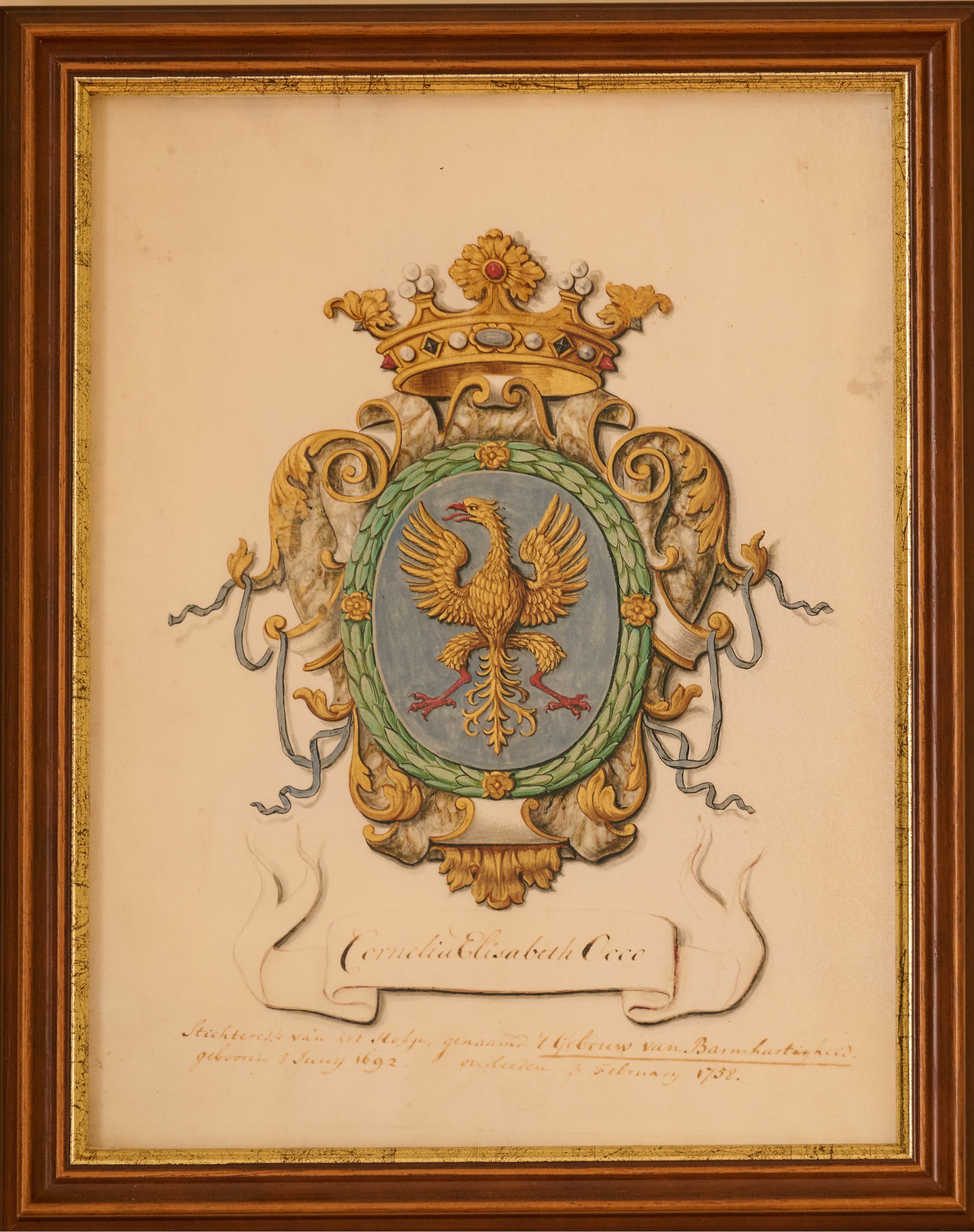 Familiewapen van Cornelia Elisabeth Occo, ongedateerd 18e eeuw, inkt en verf op perkament, 21 x 27,5 cm. Archief Stichting Occo Hofje, Amsterdam.