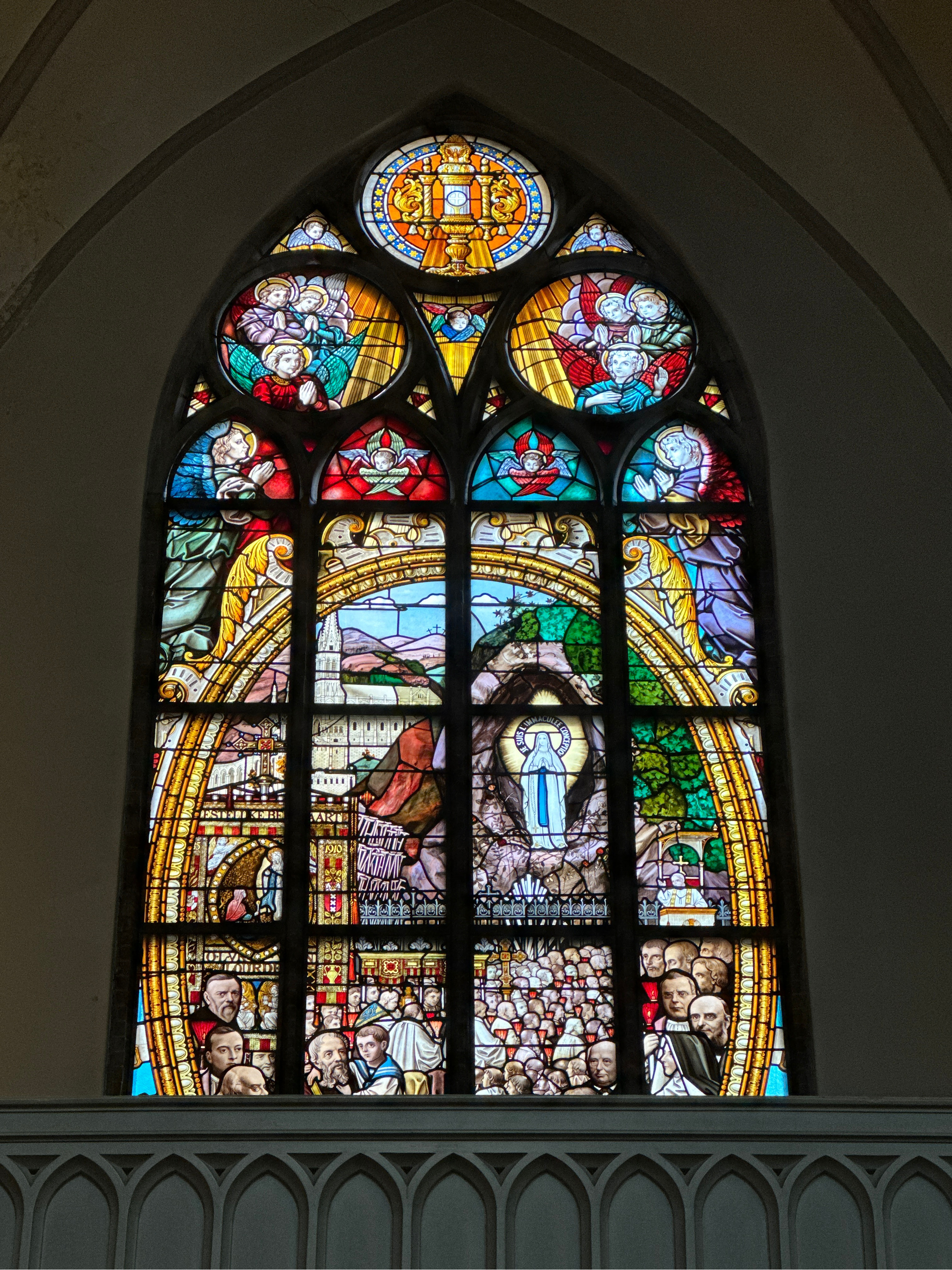 Rechter Lourdesraam, vervaardiger onbekend, 1910, glas-in-lood. Collectie Sint-Nicolaasparochie, Amsterdam.
